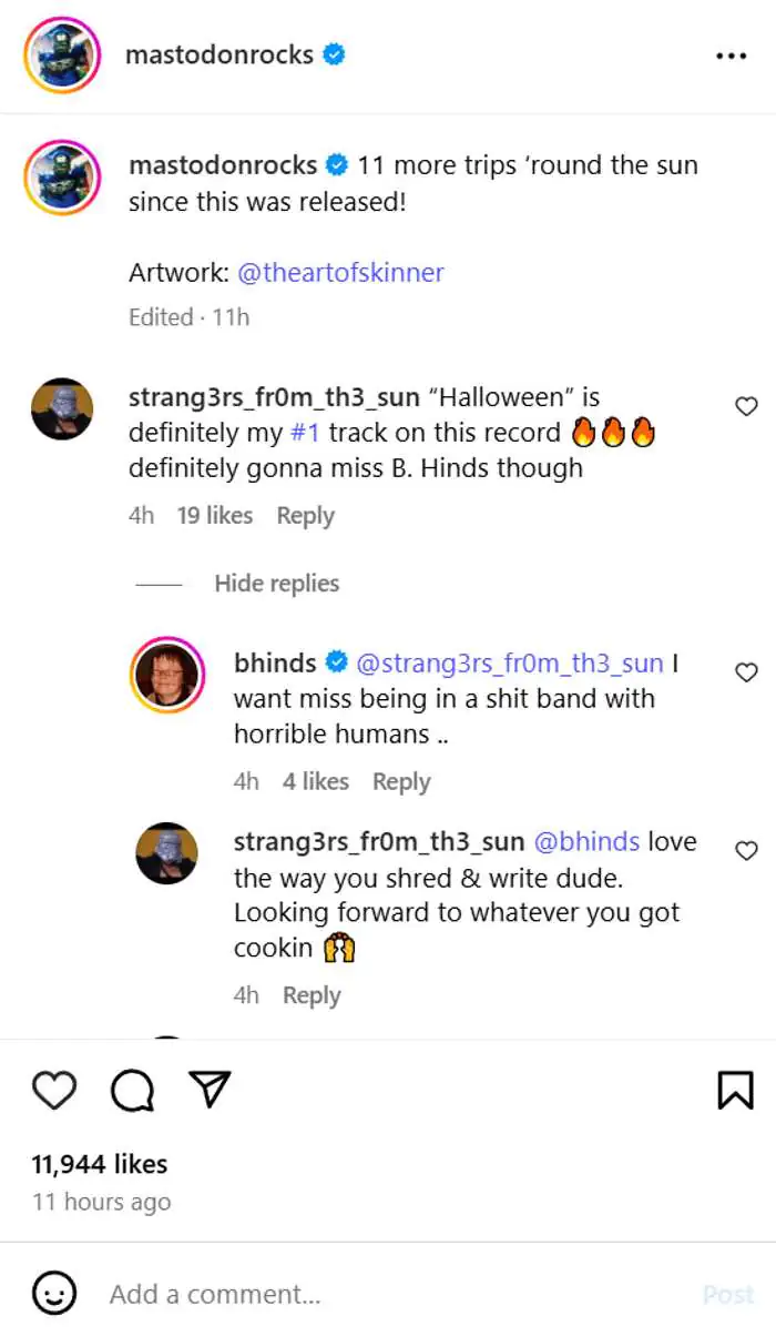 Mastodon’un resmi Instagram hesabı üzerinden, grubun 2014 çıkışlı “Once More ‘Round the Sun” albümünün 11. yıl dönümü kutlanırken, bir hayran yorum olarak “B. Hinds’i kesinlikle özleyeceğiz” yazdı. Bu yoruma bizzat Brent Hinds’in verdiği yanıt ise dikkat çekiciydi: