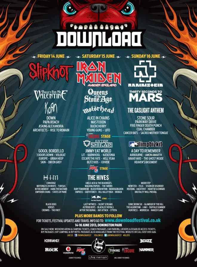Senin büyük festivallerinden birisi olan Download 2013 festivali şekillenmeye başladı. Afişi,grupları, ve gruplarından sahne alacağı günler aşağıda ki gibidir.