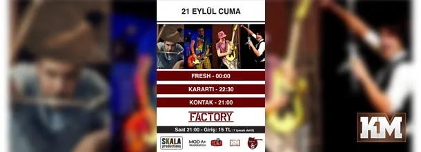 Dude & Panorama @ FACTORY – 28 Eylül Cuma Dude & Panorama Başlangıç Saati: 20.30 Giriş: 15TL (1 İçecek dahil) Dude […] 26 / 09 / 12 / GlooM / 0 Yorum K+ Komodor 64 & İÜFFRG & Totem @ FACTORY – 22 Eylül Cumartesi Komodor 64 & İÜFFRG & 3 Buçuk Başlangıç Saati: 20.30 Giriş: 15TL […] 21 / 09 / 12 / GlooM / 0 Yorum K+ Fresh & Karartı & Kontak @ Factory – 21 Eylül Cuma Fresh & Karartı & Kontak Başlangıç Saati: 20.30 Giriş: 15TL (1 İçecek […] 21 / 09 / 12 / GlooM / 0 Yorum K+ Hard ‘n’ Heavy Night Vol.2 (Psycho Circus & Legions) @ FACTORY – 27 Temmuz Cuma Hard ‘n’ Heavy Night Vol.2 (Psycho Circus & Legions) Başlangıç Saati: 20.00 […] 27 / 07 / 12 / GlooM / 0 Yorum K+