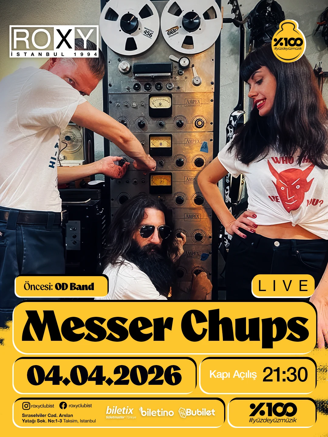 4 Nisan Cumartesi gecesi Roxy sahnesi, surf gitarlarının karanlık sinema estetiğiyle buluştuğu sıra dışı bir performansa ev sahipliği yapıyor: %100 Müzik katkılarıyla Messer Chups İstanbul’da.