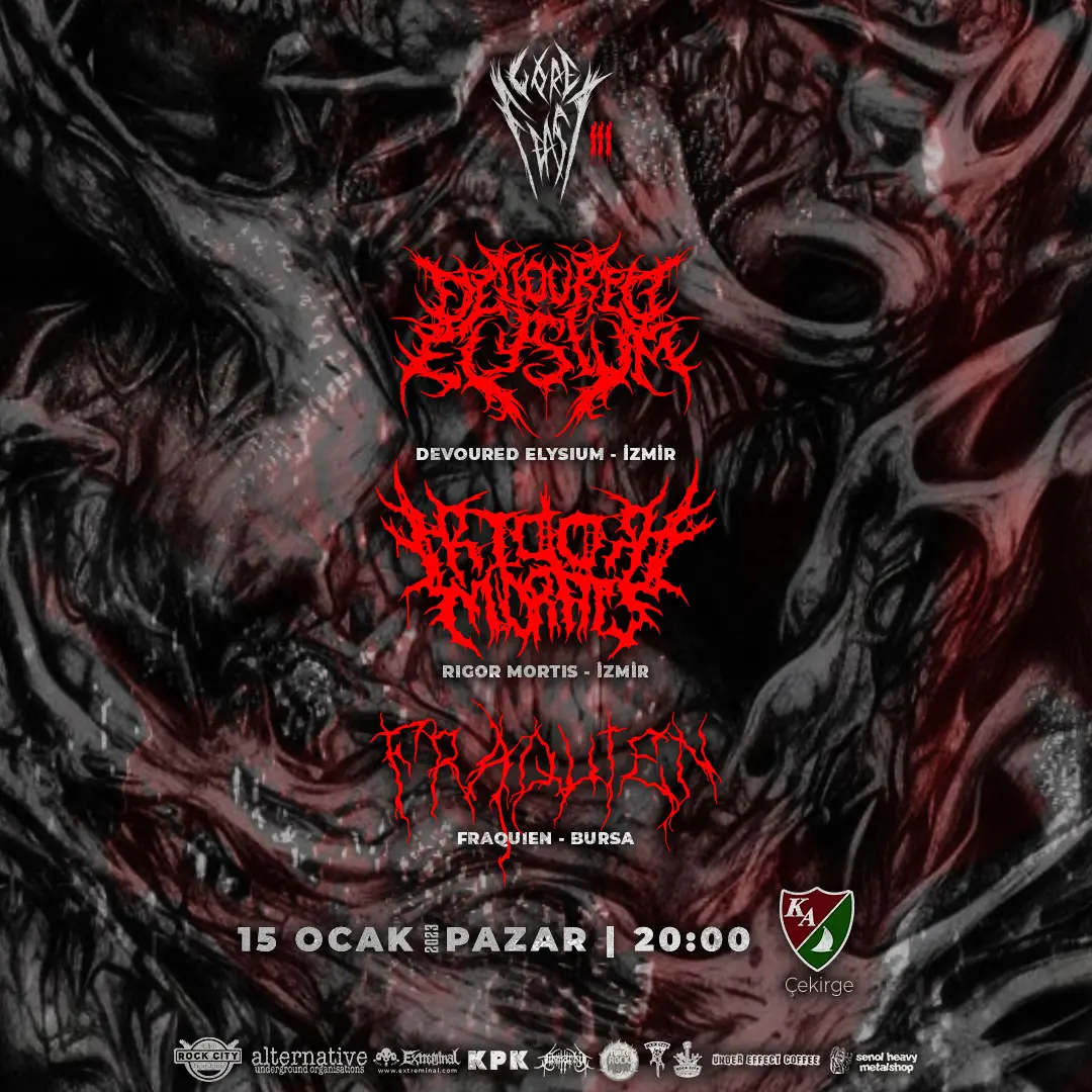 15 Ocak 2023 Pazar günü Ka Bar Çekirge sahnesinde Devoured Elysium, Rigor Mortis, Fraquien sahne alacak.