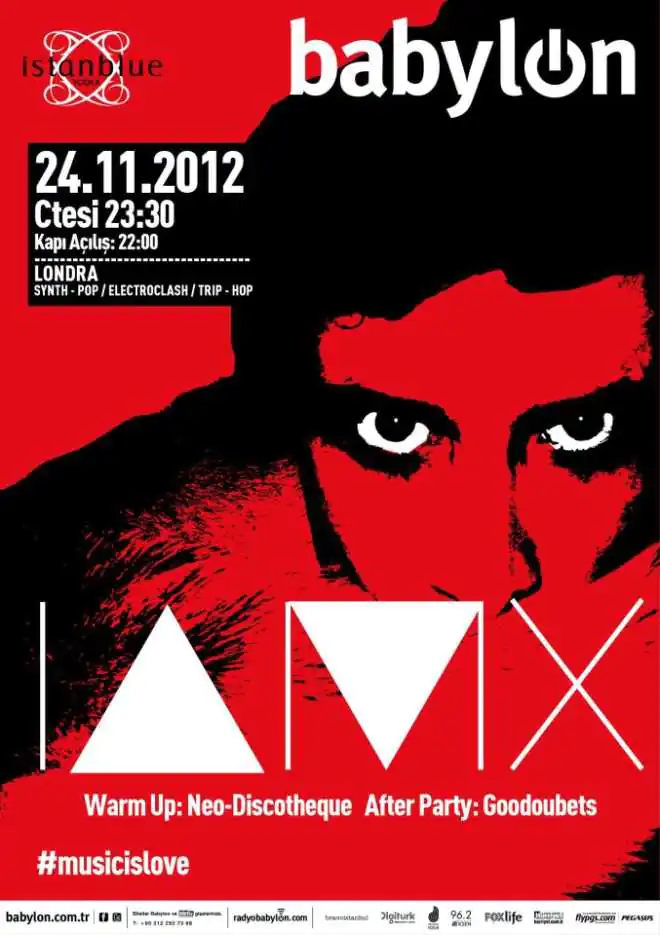 Ünlü İngiliz trip-hop grubu Sneaker Pimps’in solisti Chris Corner’ın solo projesi IAMX, İstanblue’nun katkılarıyla, 24 Kasım gecesi Babylon sahnesine yeniden konuk oluyor. Şarkı sözlerinde seks, din, politika, biseksüellik gibi tabu konuları işleyen Corner, memleketi İngiltere’yi terk ederek Berlin’e yerleştikten sonra tamamen müzik endüstrisinden bağımsız bir ruhla orijinal çalışmalarına devam ederek, bu değişimin meyvelerini toplamaya devam ediyor. 80’lerin elektrolarından büyük izler taşıyan çıkış albümü Kiss & Swallow’u 2004 yılında IAMX adı altında yayınlayan Chris Corner, eski Sneaker Pimps kayıtlarına da bu albümde yer vermişti. Daha sonra sırasıyla The Alternative, Live in Warsaw, Kingdom of Welcome Addiction ve Dogmatic Infidel Comedown OK albümlerini çıkaran aykırı müzisyen, 2011 yılında Volatile Times’ı piyasa süren IAMX, canlı performansında ona eşlik eden grubuyla beraber yine hayal kırıklığına uğratmayan, sansasyonel performanslarından biri için İstanbullu hayranlarıyla coşkulu ve yoğun bir buluşma yaşayacak.