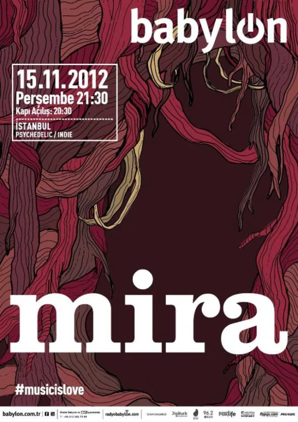 İstanbul müzik sahnesinin yenilikçi oluşumlarından Nada grubundan Miray Kurtuluş ve Portecho’dan tanıdığımız Tan Tunçağ’ın ortak projesi Mira, 15 Kasım Perşembe akşamı Babylon’da. İlk albümleri “Eve Dönmeliyim”i 2008’de çıkaran Mira, ikinci stüdyo albümleri “Ayda Kahvaltı”yı WePlay etiketiyle geçtiğimiz mayıs ayında yayınlamışlardı. Adını ölmekte olan bir yıldızdan alan Mira, bu albümde hikayelerini saf melodiler, kalp atışına denk synthler ve çarpıcı sözlerle anlatıyor. Şarkılarında farklı boyutlar arasında gidip gelen, yaşadıklarını, hissettiklerini görsel ve işitsel olarak etkileyici bir şekilde anlatan Mira’ya konserlerinde davulda Ulaş Özbiçer, gitarda Arda Erboz eşlik ediyor.