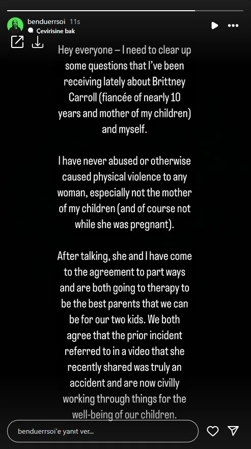 “Merhaba herkese – Son zamanlarda Brittney Carroll (yaklaşık 10 yıldır nişanlım ve çocuklarımın annesi) ve benimle ilgili aldığım bazı soruları açıklığa kavuşturmam gerekiyor.
