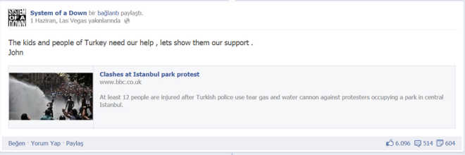 Bu arada System of a down demiş iken, zamanında haberini yapmadık ama şimdi söylemeden geçmek olmaz. Soad resmi facebook sayfasından Türkiye’de ki hayranlarına gezi parkı direnişini desteklediklerini de resmen duyurmuş oldu.